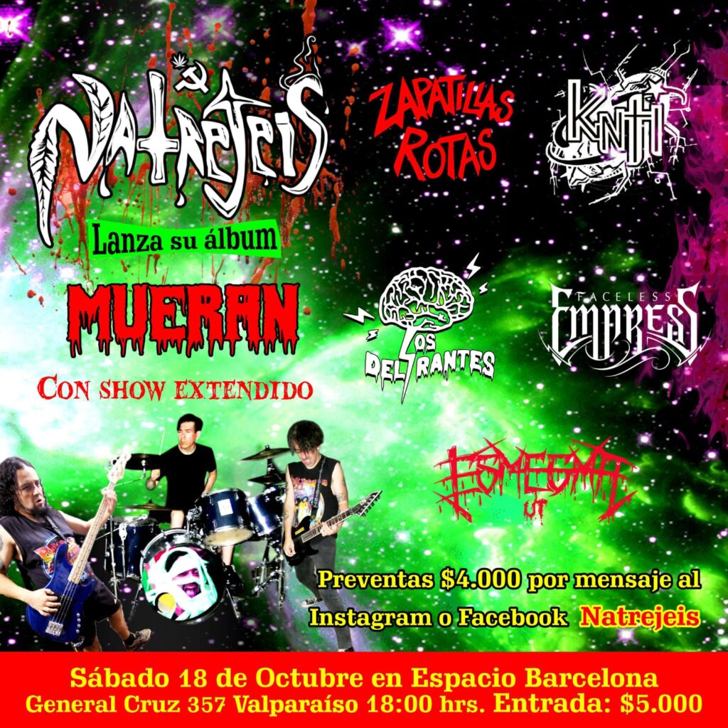 Natrejeis, presentara su nuevo EP “Mueran” este sábado 18 de octubre en Espacio Barcelona (General Cruz #357 – Valparaíso), también tendremos copias en cd de nuestro Ep a la venta. El evento será a partir de las 18 hrs y también nos acompañarán nuestras bandas amigas: