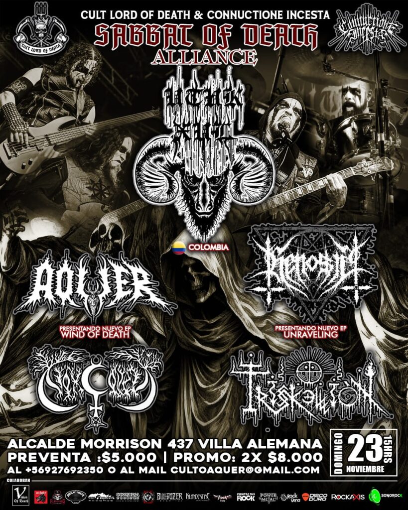 Este domingo 23 de noviembre en la Quinta Región, las sombras se alzarán con alevosía en “Sabbat of Death Alliance”, ritual forjado por Cult Lord of Death y Connuctione Incesta Records & Prods. Todo esto en una tarde donde las entidades de la muerte se manifiestan a través de la música.