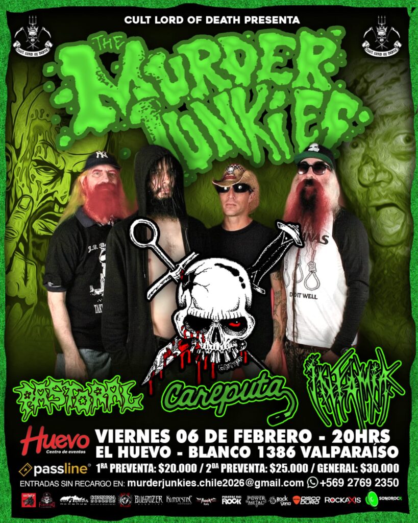 La agrupación originaria de Texas, fundada en 1990 bajo el alero del icónico GG Allin, realizará tres presentaciones en nuestro territorio, haciendo su debut en Rancagua, junto a las bandas Spectral Sacrifice y Pastoral. Los Gatos Bar, Jueves 05 de Febrero a las 19:00 horas. Rubio 331. Venta de tickets en: https://www.passline.com/eventos/murder-junkies-en-rancagua