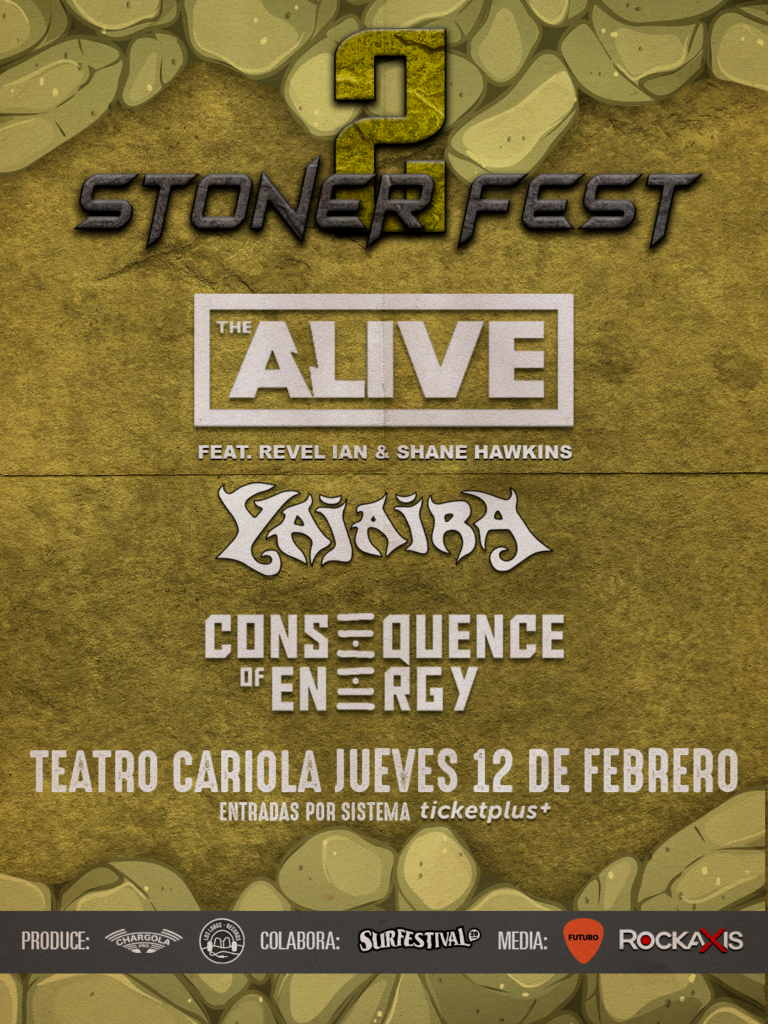 ¡Tal como lees! El festival que en su primera edición trajo a Kyuss Lives! regresa luego de 15 años para hacerte a vivir nuevamente una jornada con lo más destacado del stoner rock nacional e internacional: “Stoner Fest 2” reunirá a tres agrupaciones, dos nacionales y una internacional, en una velada memorable y veraniega que no te puedes perder. La cita será el próximo 12 de febrero en el Teatro Cariola y contará con nada menos que los estadounidenses de The Alive, además de los clásicos Yajaira y los contemporáneos Consequence of Energy.